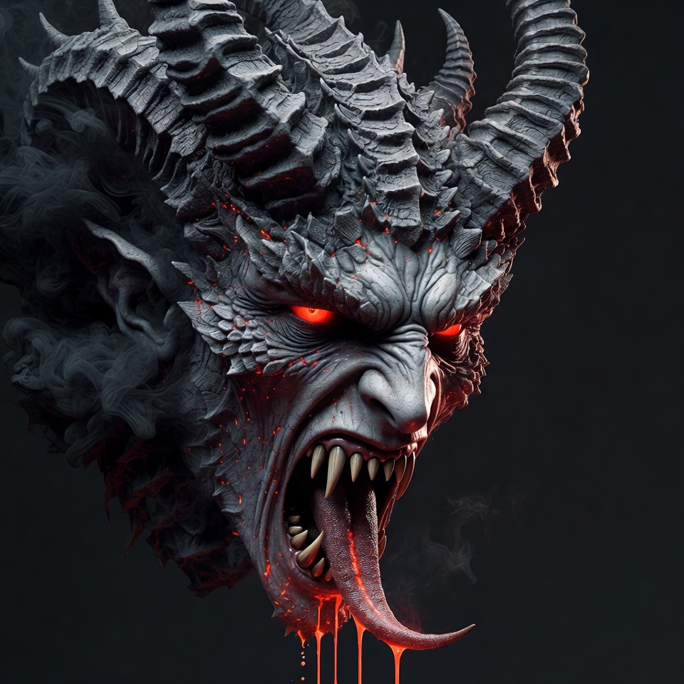 3D sculpture, curved horns, dark background, demon head, digital art, dragon scales, evil demon, fangs, fantasy creature, glowing eyes, gray skin, horns, lava tongue, monstrous face, red eyes, roaring demon, sharp teeth, smoke, snarling mouth, demon