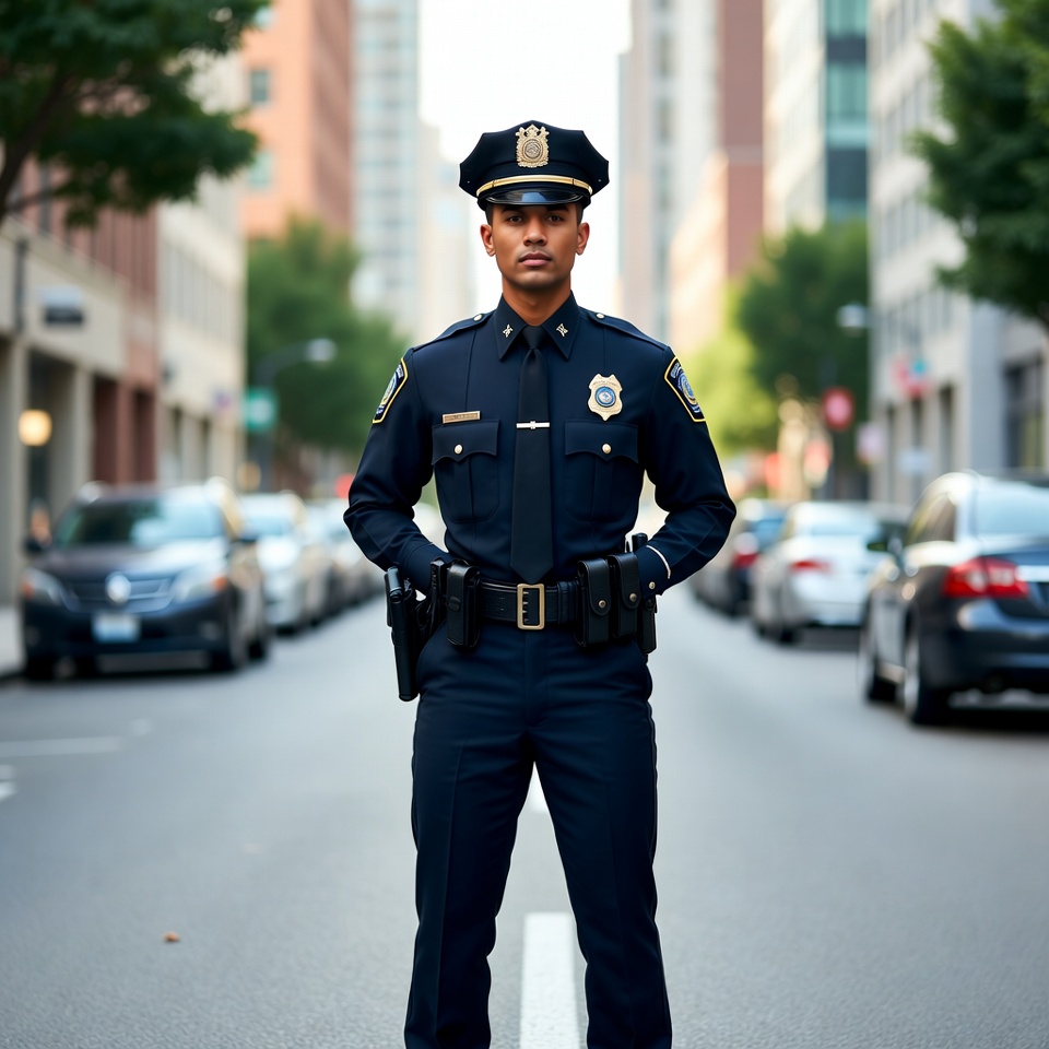 A male police officer with a dark complexion stands confidently in the middle of a city street lined with tall brick buildings and trees. He wears a navy blue police uniform, peaked cap, black tie, and carries a holstered gun and equipment belt. Parked cars are visible on both sides of the tree-lined road.