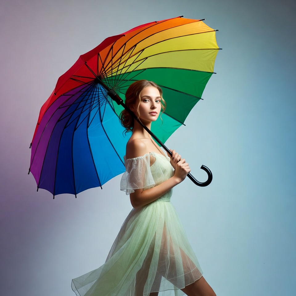 A young woman with light brown hair in an updo holds a large rainbow-colored umbrella over her shoulder. She wears a sheer light green off-shoulder dress that flows around her legs. The image features a gradient blue-gray background.