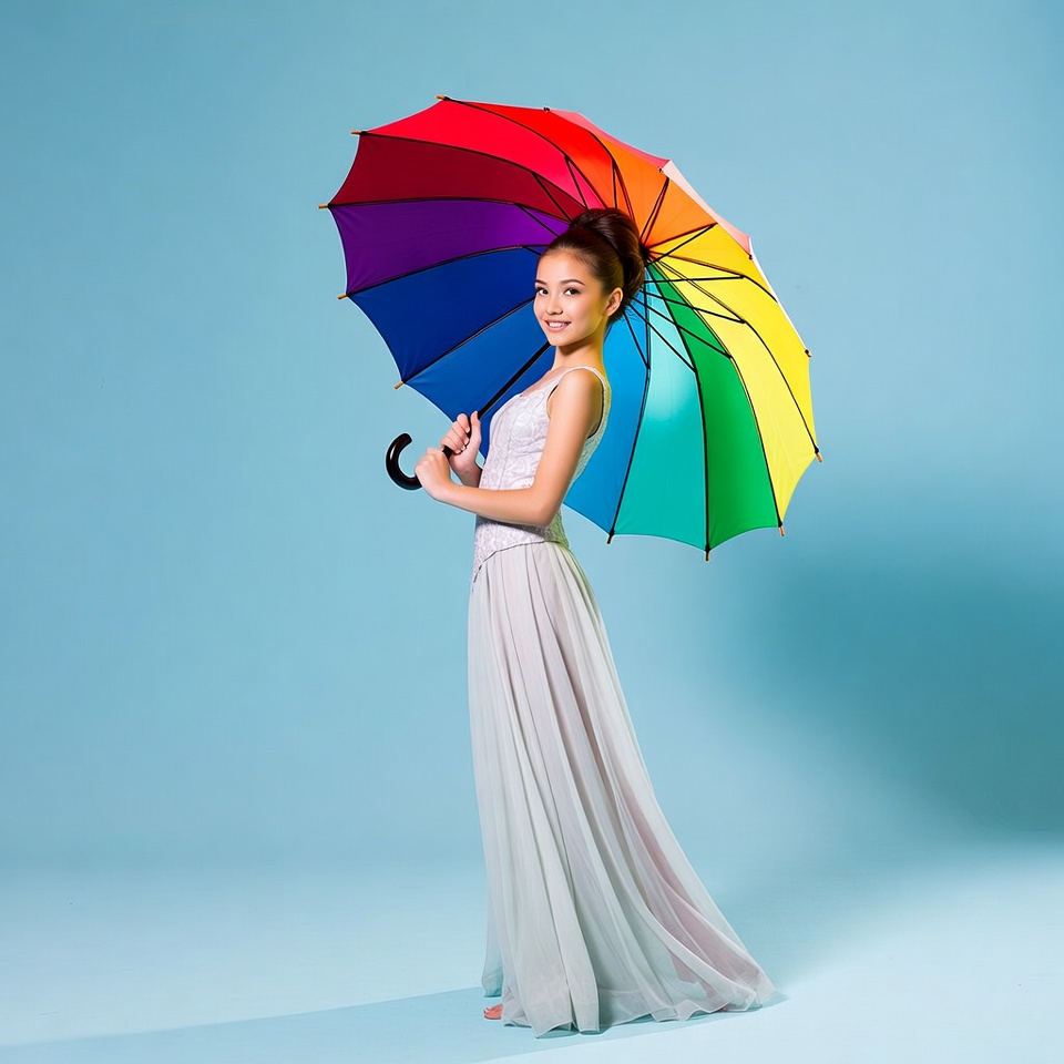 A young Asian girl with her hair in a bun stands on a blue background holding a large rainbow-colored umbrella. She wears a flowing gray dress and smiles at the camera. The umbrella's vibrant colors contrast sharply with the solid blue backdrop.