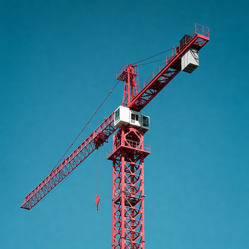 blue sky, building site, construction crane, construction equipment, crane boom, crane cab, engineering, heavy machinery, industrial crane, lattice crane, outdoor crane, red crane, sky background, tall crane, tower crane
