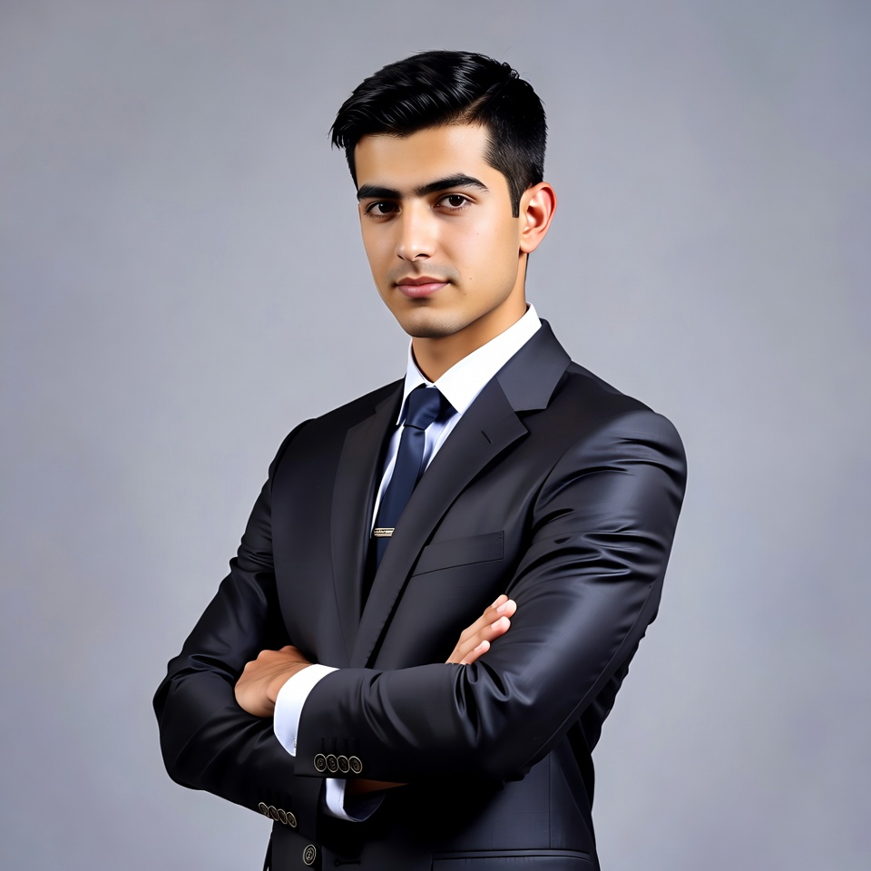 A young man with short black hair and a neat side part stands confidently with arms crossed against a plain gray background. He wears a dark black suit, white dress shirt, and blue tie, gazing directly at the camera with a subtle smile. His professional attire features a notched lapel jacket and polished appearance.