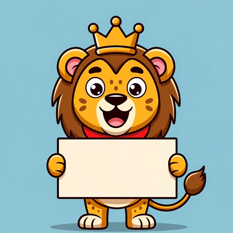 animal, big eyes, blank sign, cartoon lion, clipart, crown, cute lion, fun lion, golden crown, holding sign, illustration, isolated background, king lion, mascot, playful lion, red bow tie, smiling lion, vector art, lion