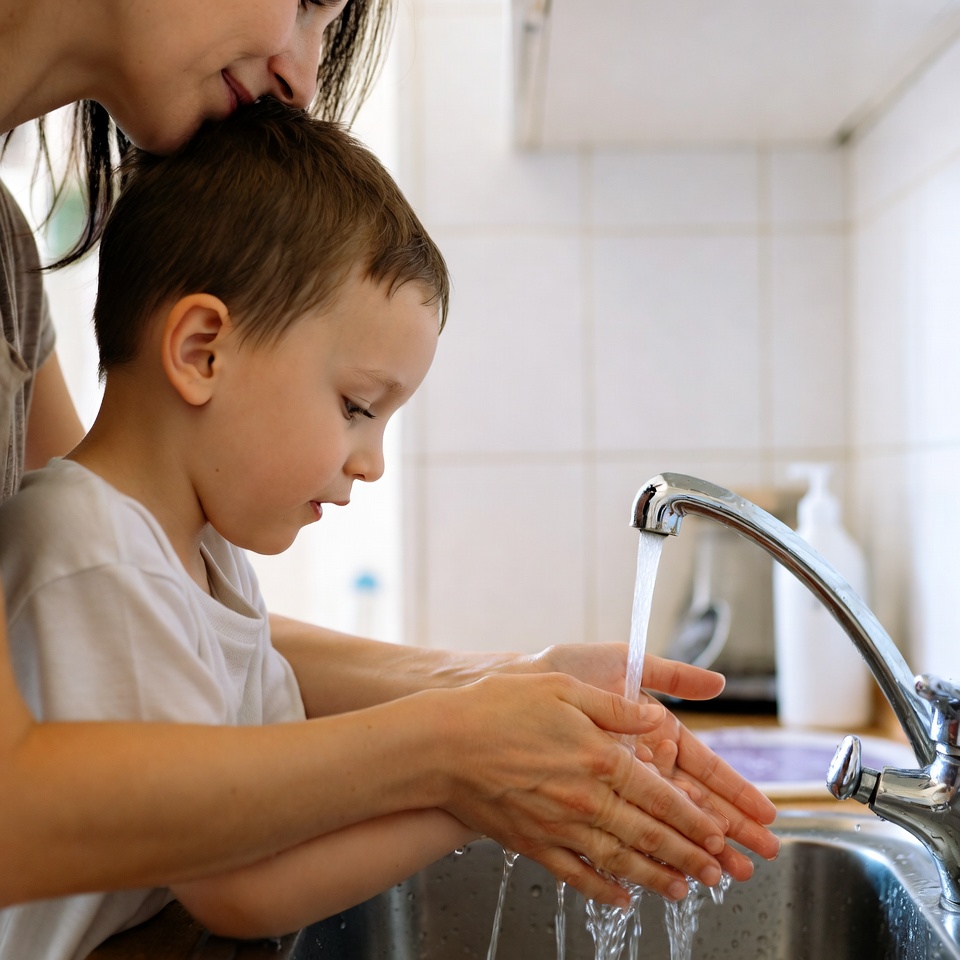 A mother with long dark hair kneels beside her young son in a kitchen sink area. She guides his hands under running water from the faucet as they wash together. The boy wears a white t-shirt, and the white-tiled kitchen includes a soap dispenser nearby.