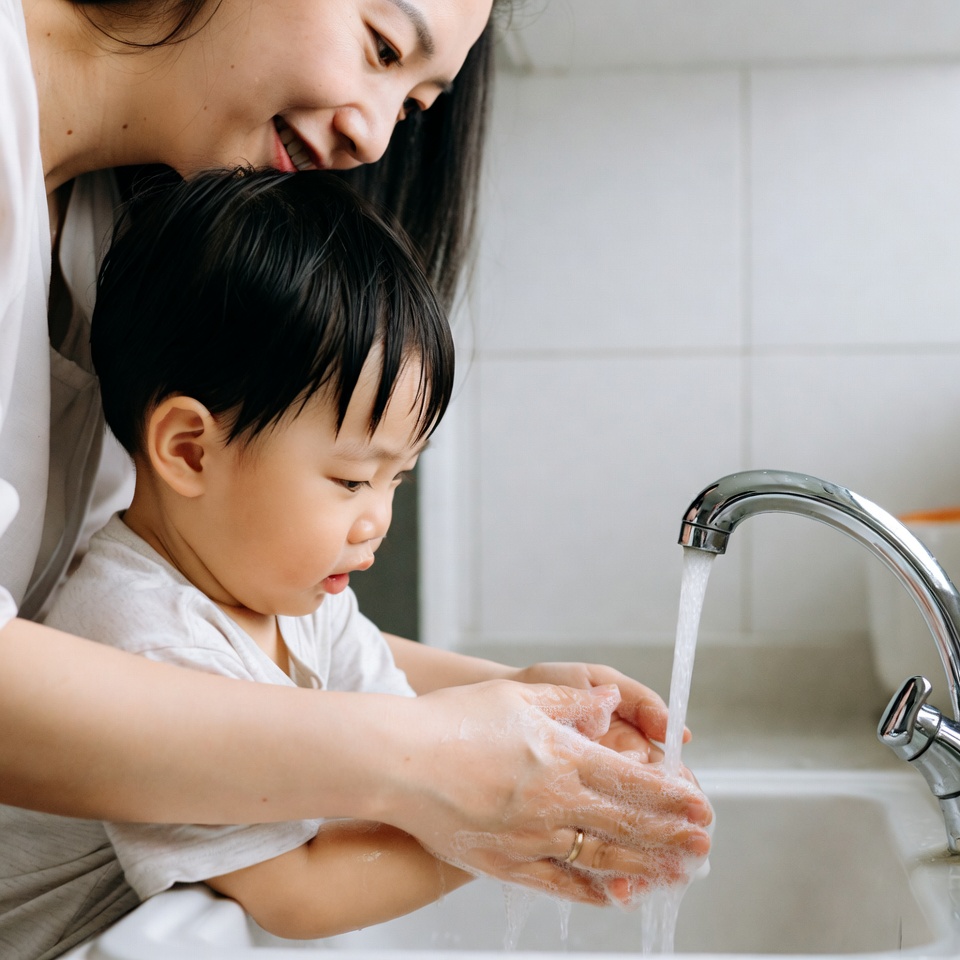 Asian, boy, bubbles, child, faucet, female, handwashing, hygiene, kitchen sink, long hair, male, parent, sink, smiling, soap bubbles, tiles, toddler, washing hands, water, white shirt, mother