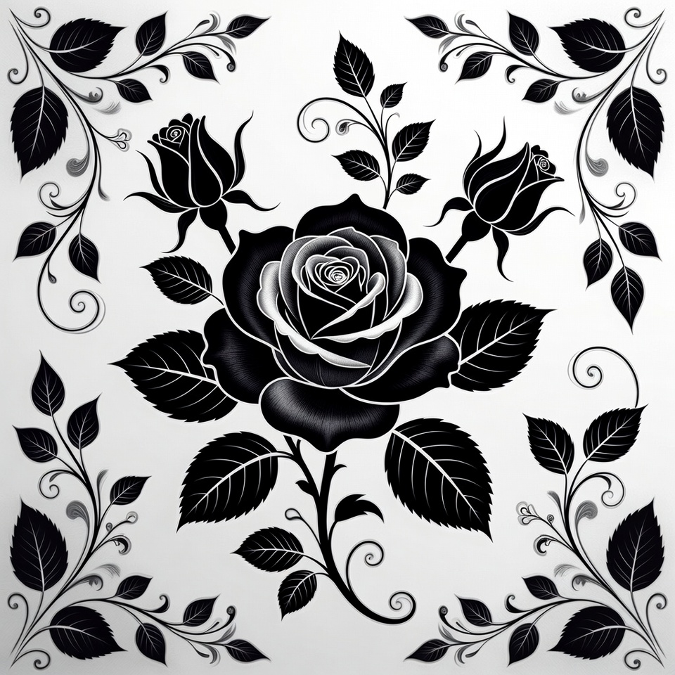 A detailed black and white illustration features a large central rose with intricate petals and leaves. Surrounding it are additional roses, stems, and swirling vines in a symmetrical floral design. The entire composition is set against a plain white background.