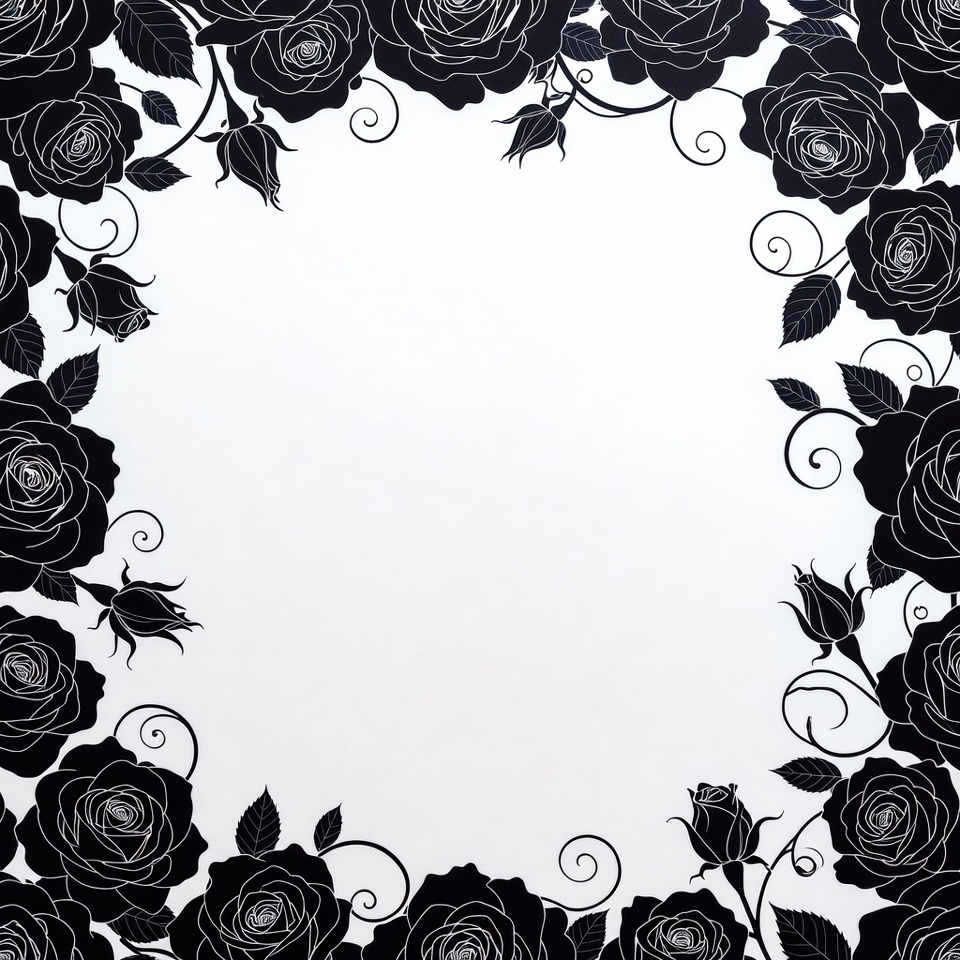 A decorative border of black silhouette roses, buds, leaves, and swirling vines frames a large empty white space in the center. The intricate floral design features detailed outlines against a white background. The roses are arranged symmetrically around the edges.