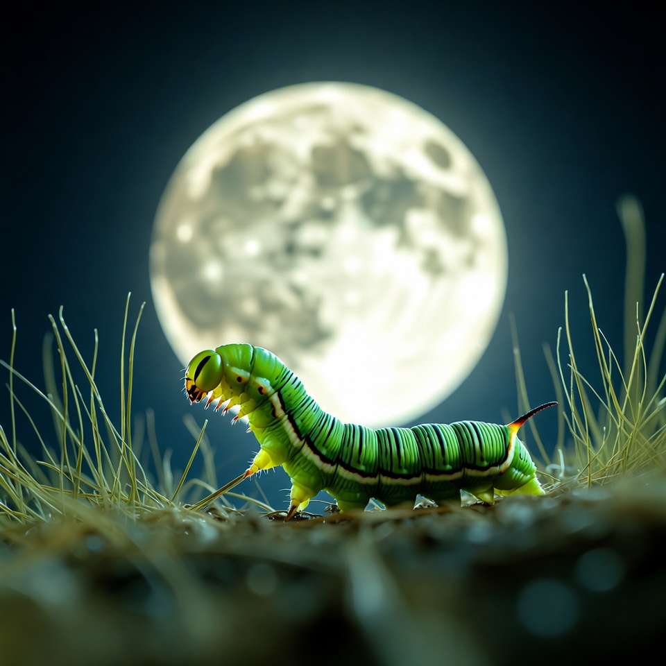 A vibrant green caterpillar with yellow stripes and red markings crawls on grass blades. A large full moon glows brightly in the dark night sky behind it. The scene features a dark background with subtle lighting highlighting the insect.