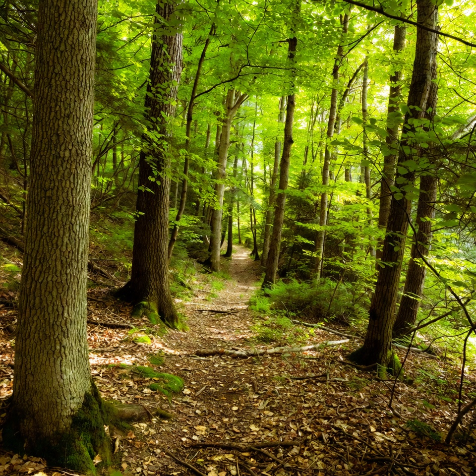 bark texture, dense woods, dirt path, earthy trail, fallen leaves, forest hike, forest interior, green foliage, green trees, green woods, hiking path, hillside trail, leaf litter, leafy trees, lush forest, moss growth, mossy trunks, nature trail, nature walk, sunlight canopy, sunlit forest, tall trees, tree trunks, undergrowth, verdant trees, wooded path, woodland scene, woodland trail, forest path