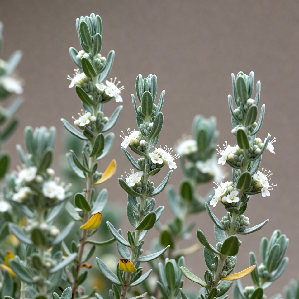 A close-up view of a grayish-green shrub with numerous upright stems bearing clusters of small white flowers. The leaves are narrow and silvery, with some yellowing edges. The plant is photographed against a blurred tan background.