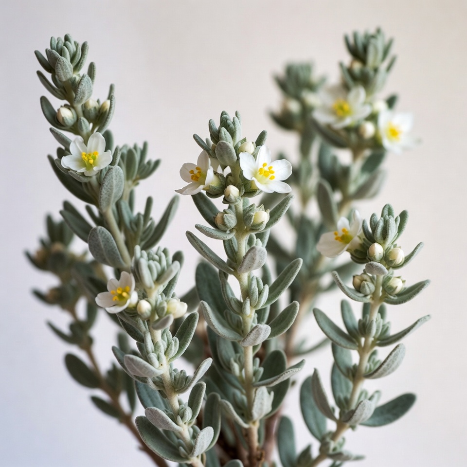 Close-up of a plant featuring clusters of small white flowers with yellow centers. The stems and leaves have a distinctive greyish-green, fuzzy texture. The plant is isolated against a plain white background.