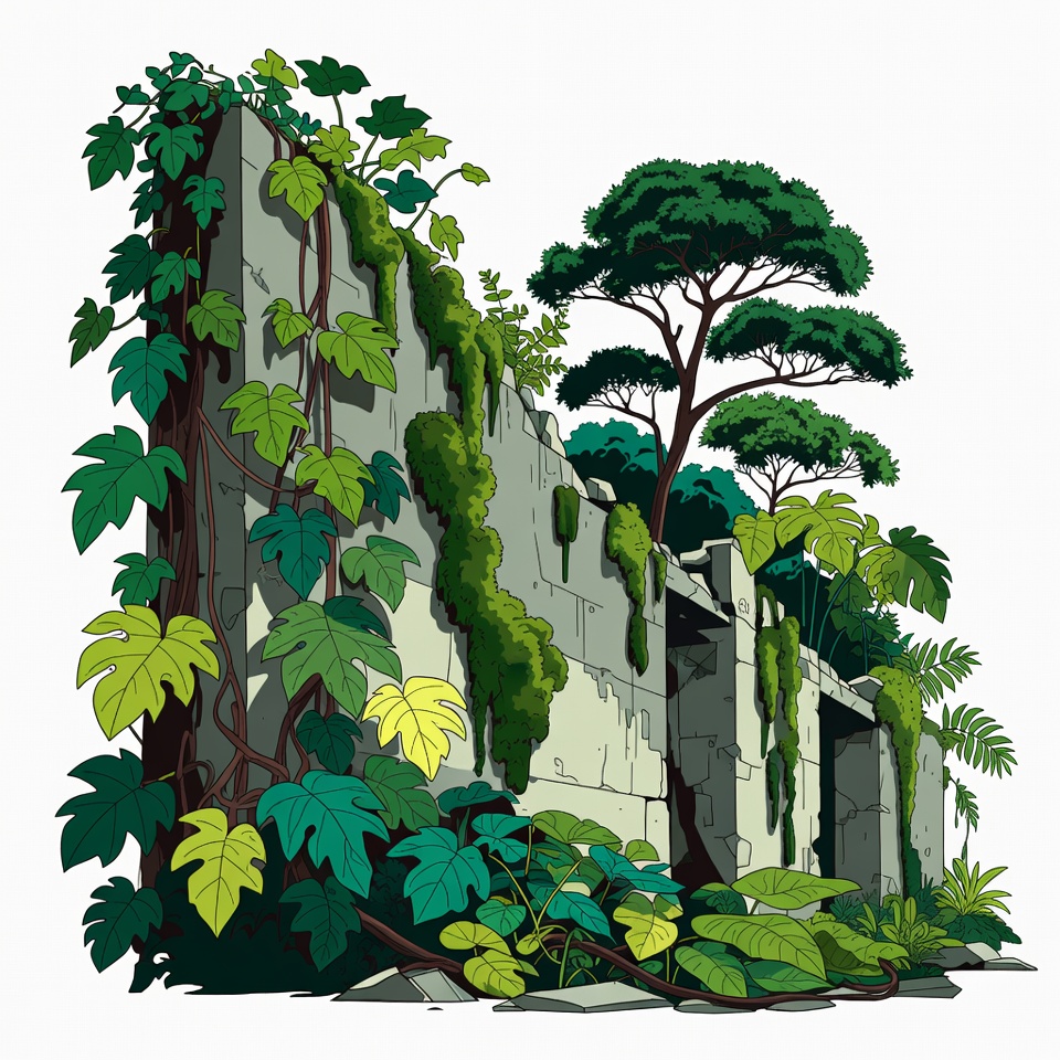 abandoned structure, clipart, crumbling ruins, foliage, green leaves, illustration, isolated background, ivy covered, jungle plants, moss, nature, overgrown vines, stone wall, tall trees, ruined wall