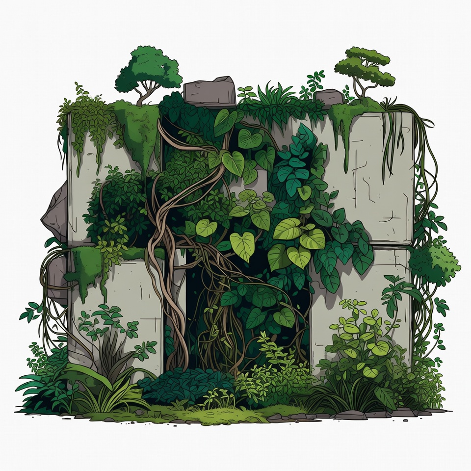A detailed illustration depicts a crumbling square stone wall completely overtaken by lush green vines, moss, and tropical plants. Thick vines twist around the weathered stones, with small trees and ferns growing from cracks and crevices. The scene is isolated on a white background.