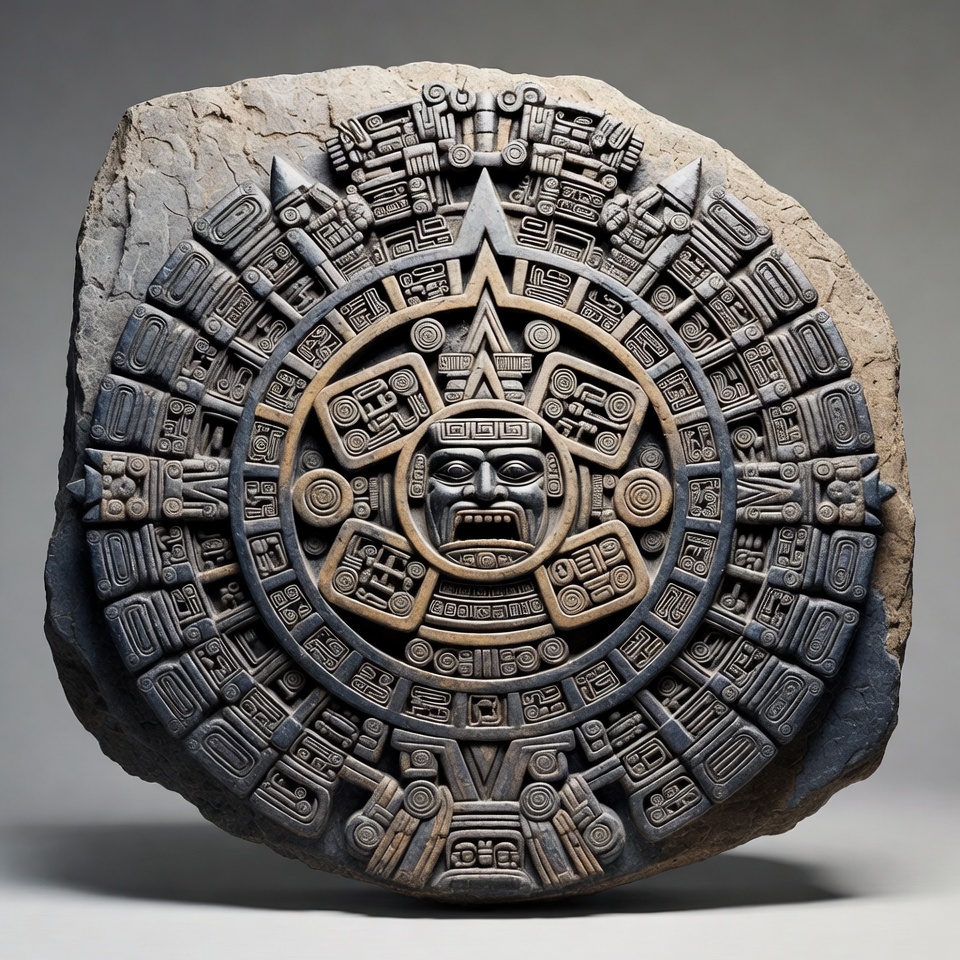Aztec Sun Stone, Aztec symbol, Mesoamerican art, Mexican history, Sun Stone, ancient artifact, beige accents, calendar stone, carvings, circular design, detailed motifs, glyphs, gray stone, indigenous art, isolated background, relief carving, snarling face, stone carving, stone sculpture, Aztec calendar