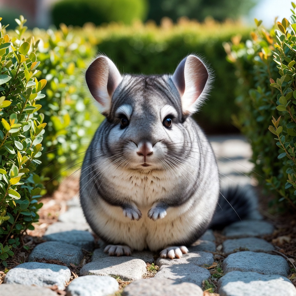 A fluffy gray chinchilla with large ears and bright eyes sits on a stone path surrounded by green hedges. Its soft fur features white underbelly and paws, and it faces forward cutely. The background shows manicured bushes and garden foliage.