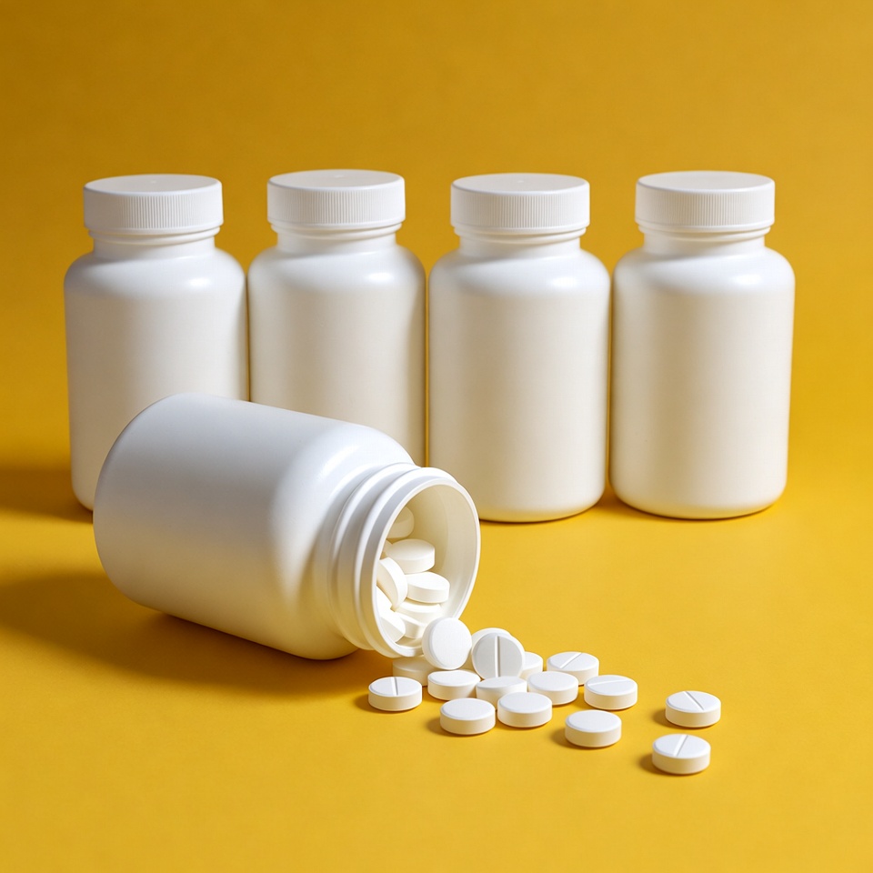 Several white plastic pill bottles are arranged on a bright yellow background. One bottle is tipped over, spilling round white pills onto the surface. The other bottles stand upright with white caps.