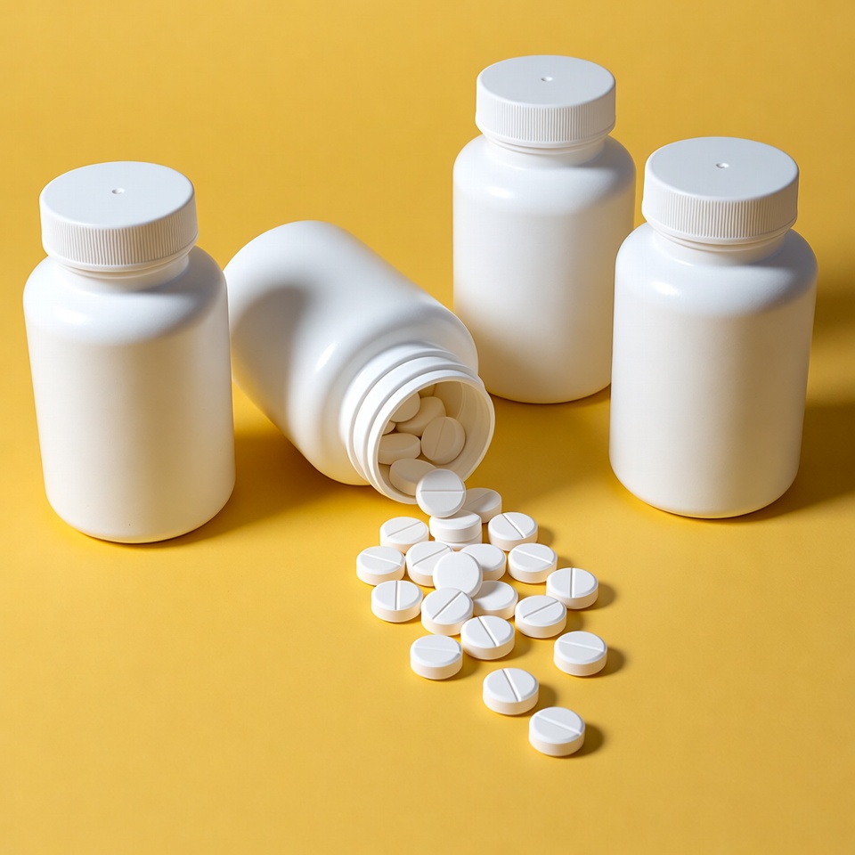 Several white plastic pill bottles are arranged on a bright yellow background. One bottle is tipped over, spilling numerous round white pills onto the surface. The other bottles remain upright with their caps on.
