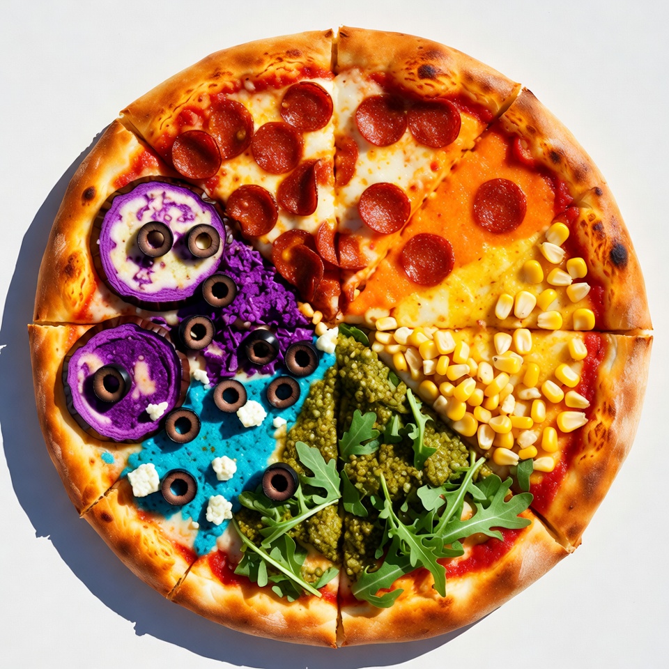 A pizza divided into four colorful slices on a white background. One slice features purple cabbage and olives, another blue sauce with olives, a green slice with pesto and arugula, and the yellow slice topped with corn kernels. Each section showcases vibrant toppings in distinct rainbow hues.