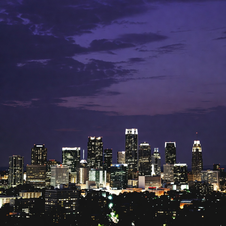 Atlanta Georgia, city at night, city lights, cityscape, clouds, dark sky, downtown Atlanta, glowing lights, high rises, illuminated towers, modern architecture, night city, night view, purple sky, skyline view, skyscrapers, tall buildings, trees foreground, urban landscape, Atlanta skyline