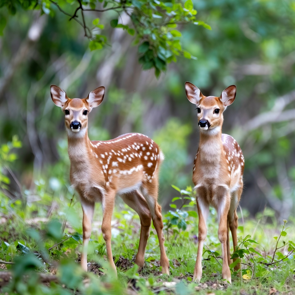animals, baby deer, deer, foliage, forest, green leaves, nature, outdoors, spotted fawns, standing deer, trees, twin fawns, wild animals, wildlife, woods, young deer, fawns