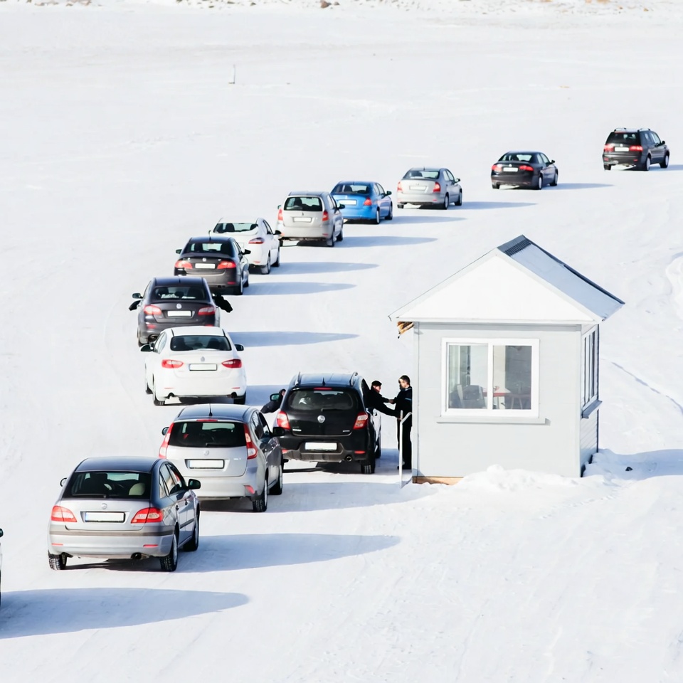 black cars, blue cars, female, isolated background, person, queue, road, snow, snowy landscape, toll booth, vehicles, white cars, winter, cars