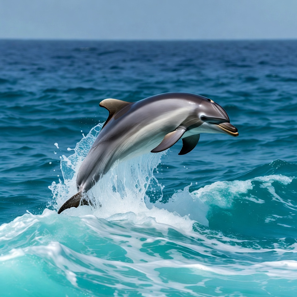 A bottlenose dolphin leaps high out of the turquoise ocean water, with its body arched gracefully in mid-air. White water splashes around its sleek gray and white form as it emerges from the waves. The background features a clear blue sky and calm sea.