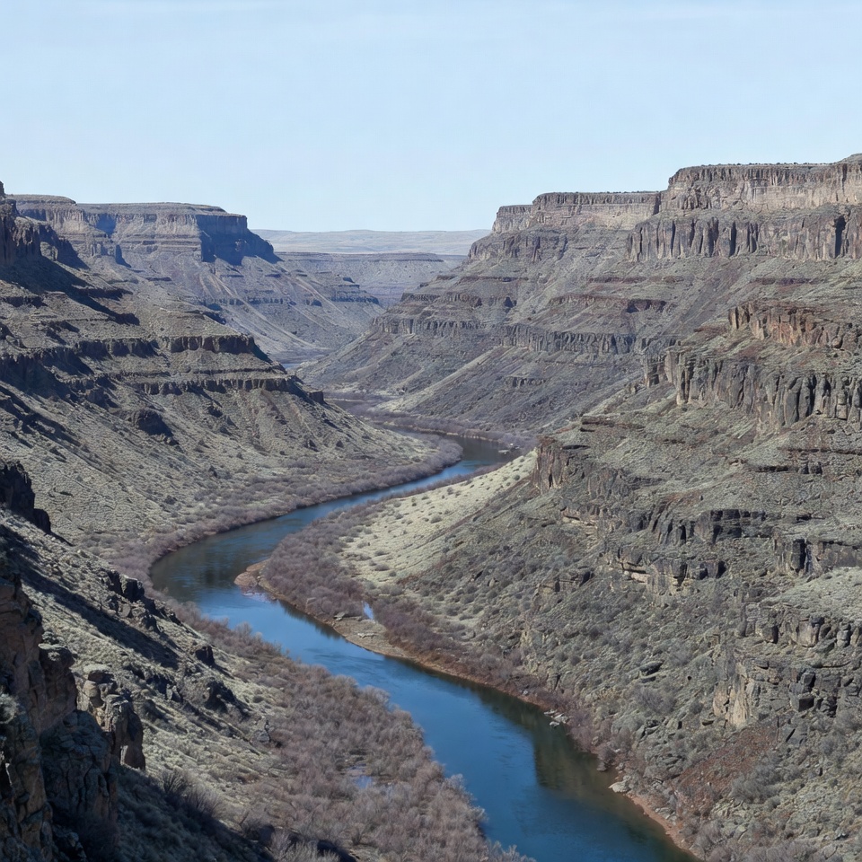 A serene river winds through a vast canyon with steep, rocky cliffs on both sides. The landscape features layered rock formations and sparse vegetation along the riverbanks under a clear blue sky. The viewpoint overlooks the narrow waterway from a high vantage point.