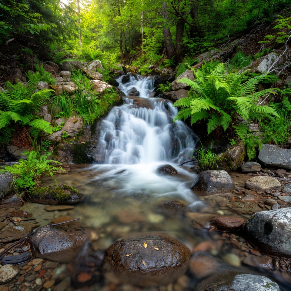 cascade, clear water, environment, ferns, foliage, forest, fresh, green, hike, landscape, lush, moss, mossy rocks, nature, outdoors, plants, pool, river, rocks, scenic, stream, sunlight, trail, trees, vegetation, vibrant, wild, woodland, waterfall