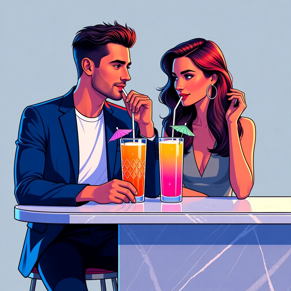 A stylish man in a navy blazer and white shirt sips an orange cocktail with a paper umbrella through a straw. Beside him, a woman with long red hair and hoop earrings drinks a pink layered cocktail with a green umbrella. They sit closely at a light-colored bar counter in a vibrant digital illustration.