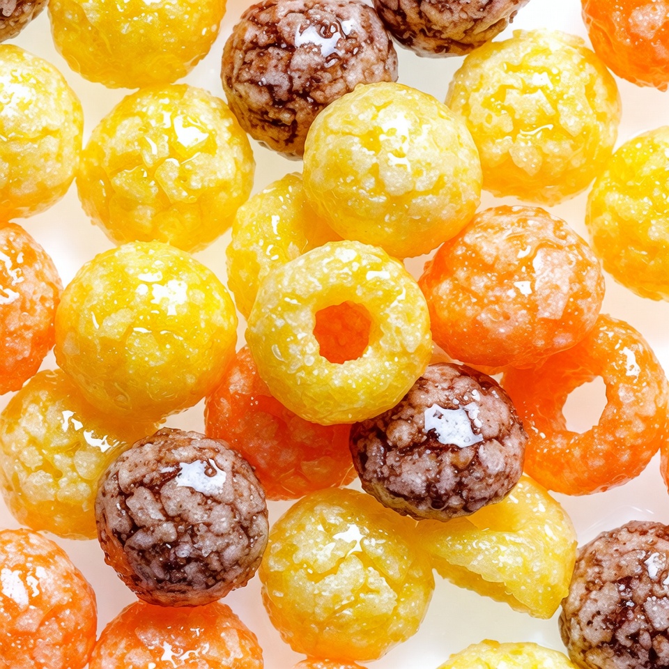 A pile of small spherical candies in vibrant yellow, orange, and brown hues with sugary coatings glistens on a white background. Some candies feature textured, crackled surfaces and glossy sheens. The assortment includes whole balls and a few with central holes.