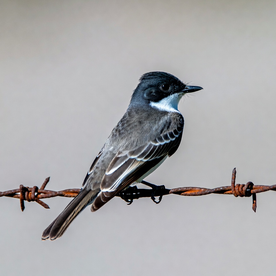 barbed wire, bird, birdwatching, black bird, fence, flycatcher, gray wings, nature, perched, phoebe bird, rusted wire, songbird, tail feathers, white throat, wildlife, black phoebe