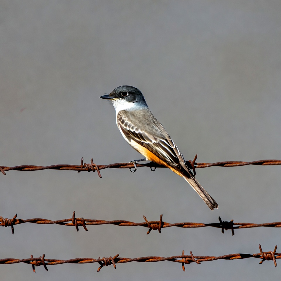 avian, barbed wire, bird, bird photography, birdwatching, feathers, fence, flycatcher bird, gray head, isolated background, nature, orange wings, perched, rusty wire, songbird, white breast, wildlife, Vermilion Flycatcher