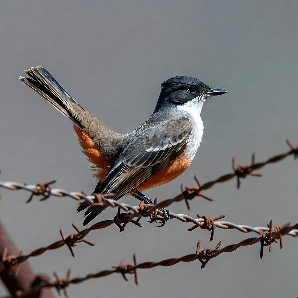 A vibrant Vermilion Flycatcher bird with a black head, white underbelly, and orange-red wings perches on a barbed wire fence. Its tail fans out slightly, and it stands against a blurred grayish background. The bird's beak is pointed, and its feathers show detailed gray and orange patterns.