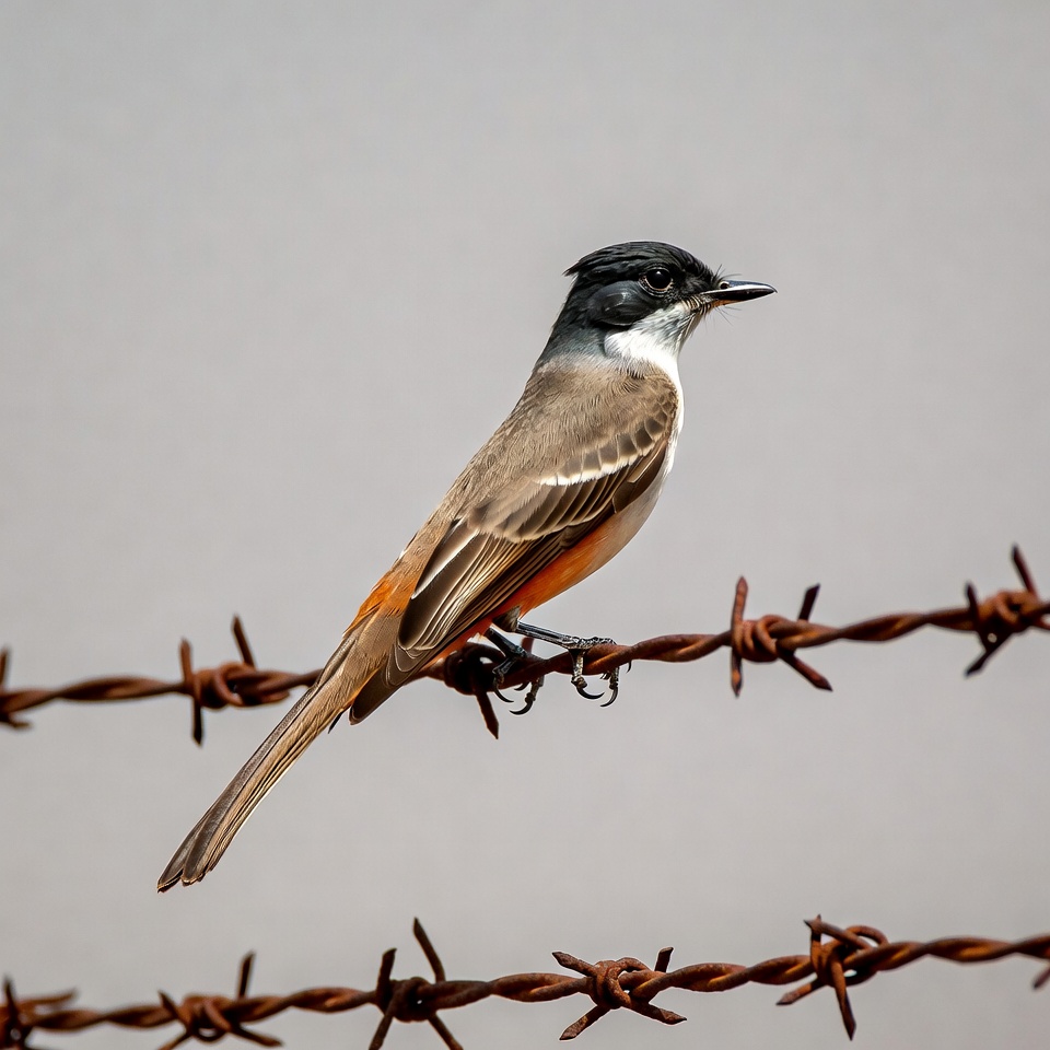 avian, barbed wire, birdwatching, black crest, feathers, fence, gray wings, isolated background, mockingbird, nature, orange tail, outdoor, perched, rusted wire, sharp beak, songbird, white belly, wildlife, bird