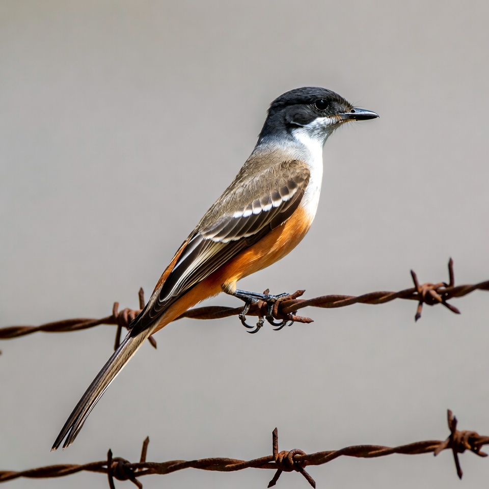 A small bird with a black cap, white underbelly, and orange-brown wings perches on a barbed wire fence. Its long tail feathers extend behind it, and it has a sharp beak. The background is a plain gray sky.