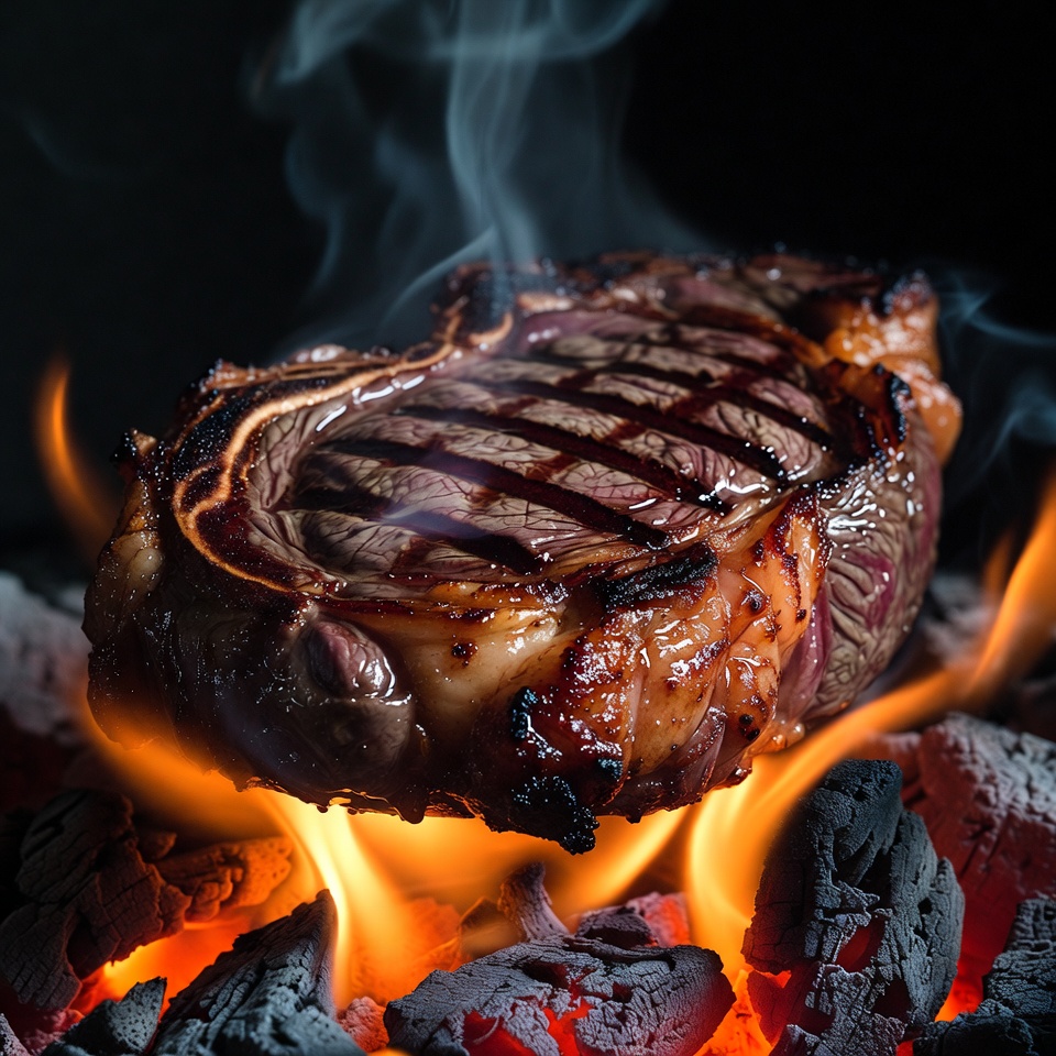 barbecue, beef, embers, fire, flames, food photography, gourmet steak, grill marks, grilled steak, hot steak, isolated background, juicy steak, meat, ribeye steak, seared meat, sizzling steak, smoke, steam, steak