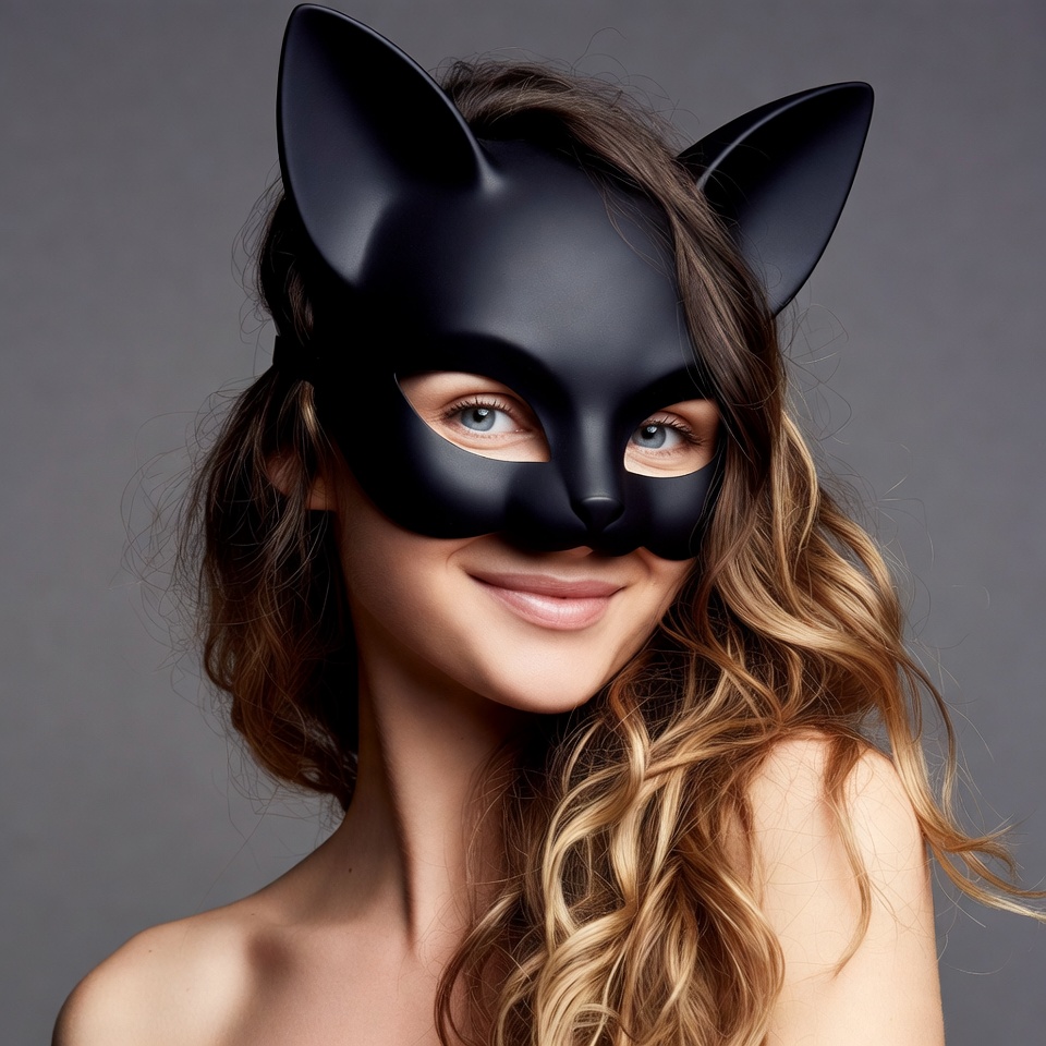 A young woman with long wavy blonde hair wears a glossy black cat mask covering her eyes and nose. She smiles playfully with her lips visible below the mask, set against a plain gray background. Her shoulders are bare, emphasizing the mask as the focal point.