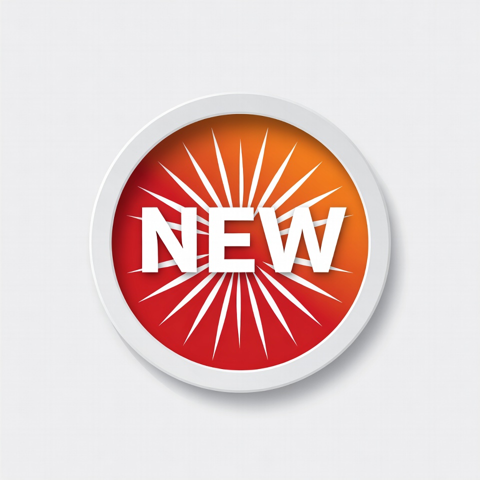 bold letters, circular badge, clipart, graphic design, illustration, isolated background, new label, new sign, orange sunburst, product label, promotion badge, radiating rays, red rays, sale tag, sunburst, vector graphic, white text, new badge