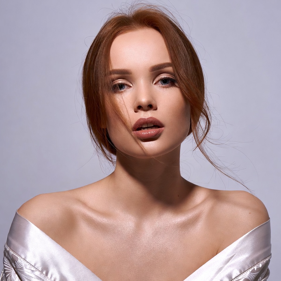 A young woman with long red hair styled in a loose updo gazes at the camera with subtle makeup and glossy lips. She wears a silky white off-shoulder top that reveals her shoulders and collarbone. The image features a plain light blue background with soft lighting.