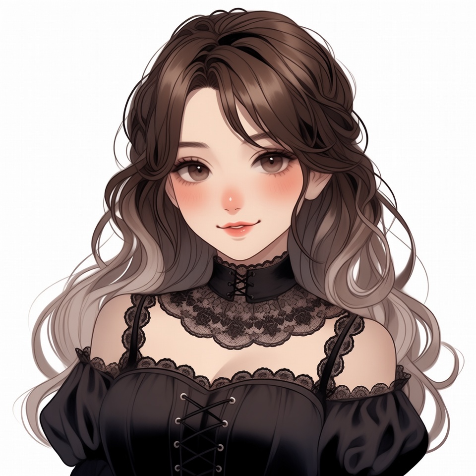 Asian, black dress, blush, brown hair, cute girl, detailed eyes, digital art, female, gothic fashion, high collar, illustration, isolated background, kawaii, lace dress, off-shoulder dress, portrait, silver hair, smiling, soft shading, wavy hair, anime girl
