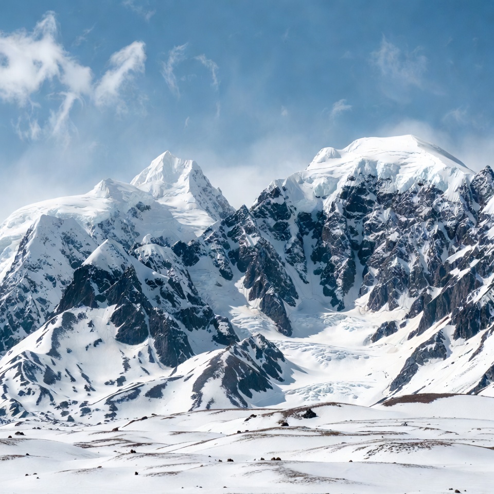 alpine landscape, blue sky, clear sky, clouds, frozen landscape, glaciers, high peaks, ice, majestic mountains, mountain range, nature, outdoors, rocky ridges, rugged mountains, scenery, snow, snowy peaks, white snow, winter mountains, mountains