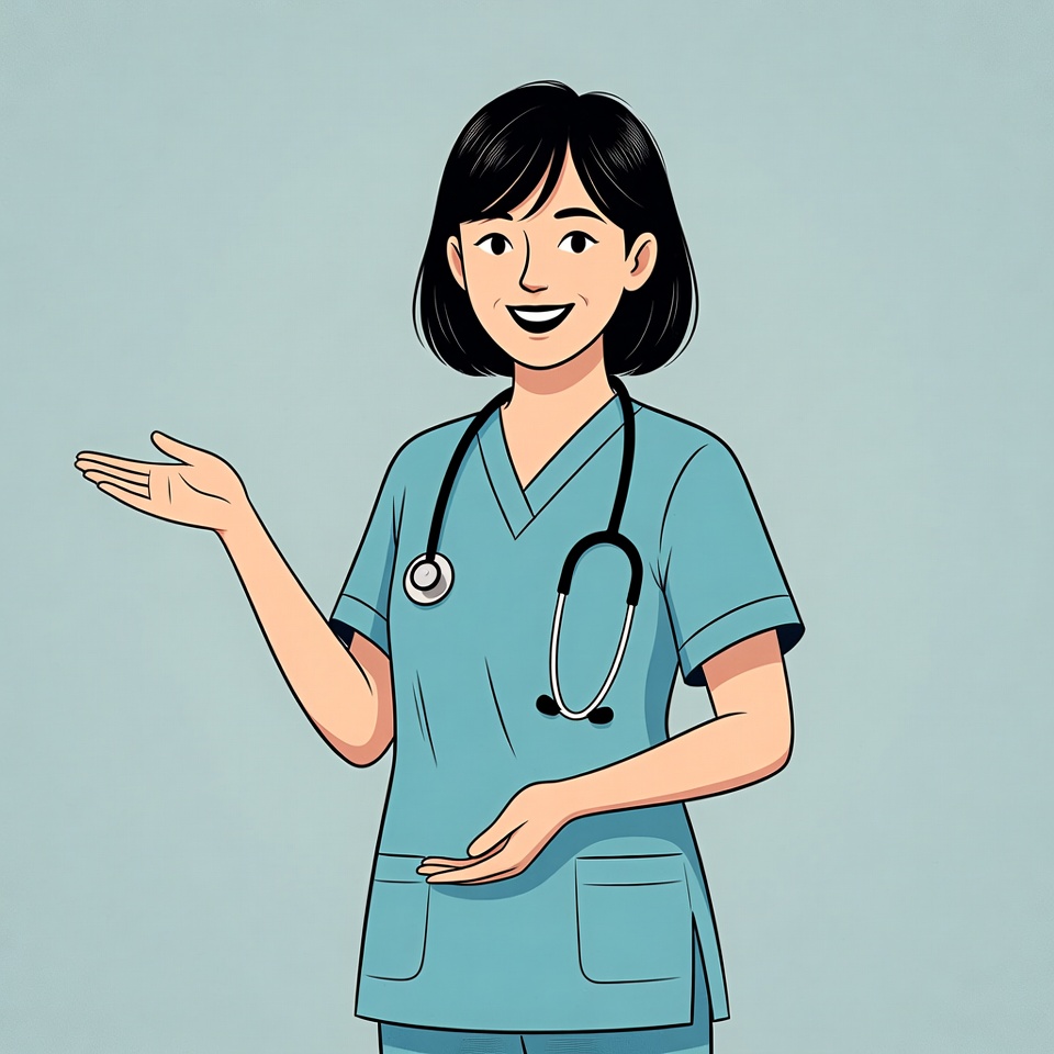 A smiling Asian woman in a blue nurse uniform holds a stethoscope around her neck and gestures with one open hand extended forward. She has short black hair and stands against a plain light blue background. The illustration features clean lines and a friendly expression.