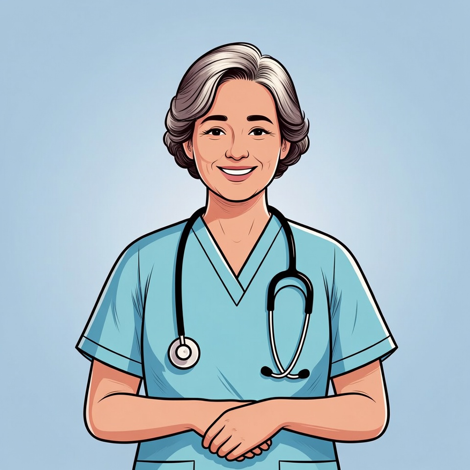 A cartoon illustration of an elderly Asian woman dressed as a nurse, wearing a light blue scrub top and stethoscope around her neck. She has gray curly hair, smiles warmly, and stands with arms crossed on a plain blue background. The image features a friendly, professional nurse in a vector art style.