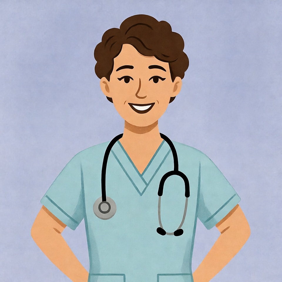 A smiling Asian woman with curly brown hair stands confidently wearing a light blue scrub top and stethoscope around her neck. She has hands on hips against a solid light blue background. The illustration features a friendly expression and detailed medical uniform.