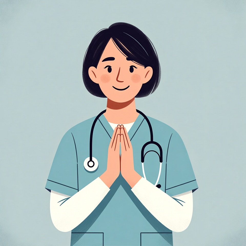 A smiling Asian woman dressed in a blue nurse uniform and white long-sleeve shirt stands with hands pressed together in prayer. A stethoscope hangs around her neck. The illustration features her on a plain light blue background.