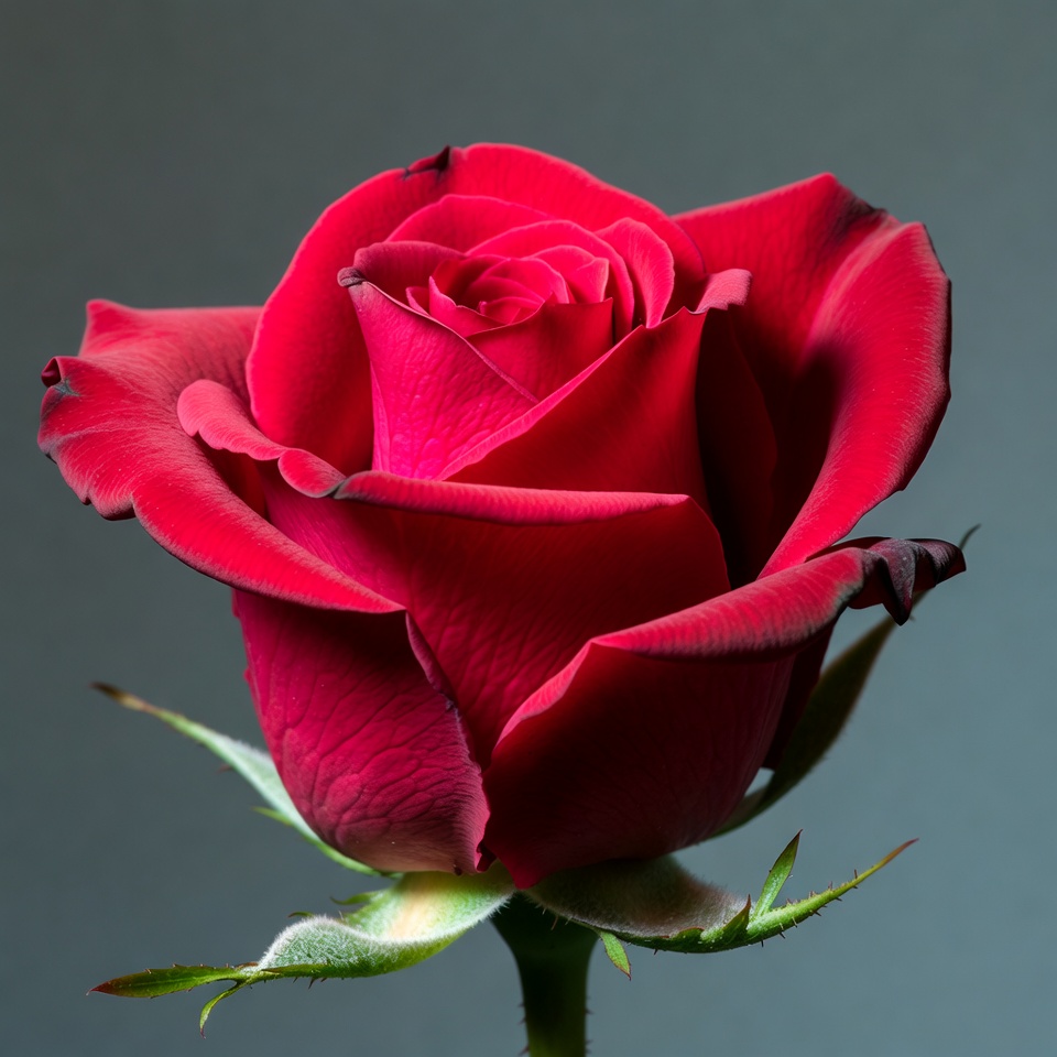 A vibrant red rose with layered petals is centered against a smooth gray background. The flower features detailed textures on its velvety petals and a green stem with small thorns. Subtle lighting highlights the rose's rich crimson color and intricate folds.