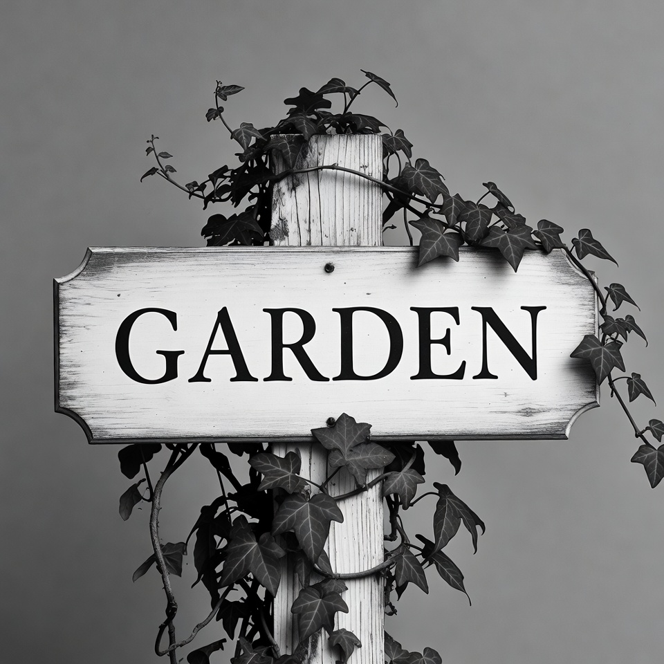 A white wooden sign with 'GARDEN' written in bold black letters stands on a post. Ivy vines climb and wrap around the post and edges of the sign. The image is in black and white against a gray background.