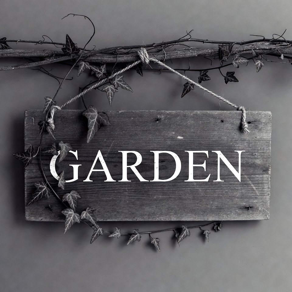 A wooden sign hanging from ropes spells out 'GARDEN' in large white letters. It is covered with twisting ivy vines and leaves. The image is presented in black and white against a gray background.
