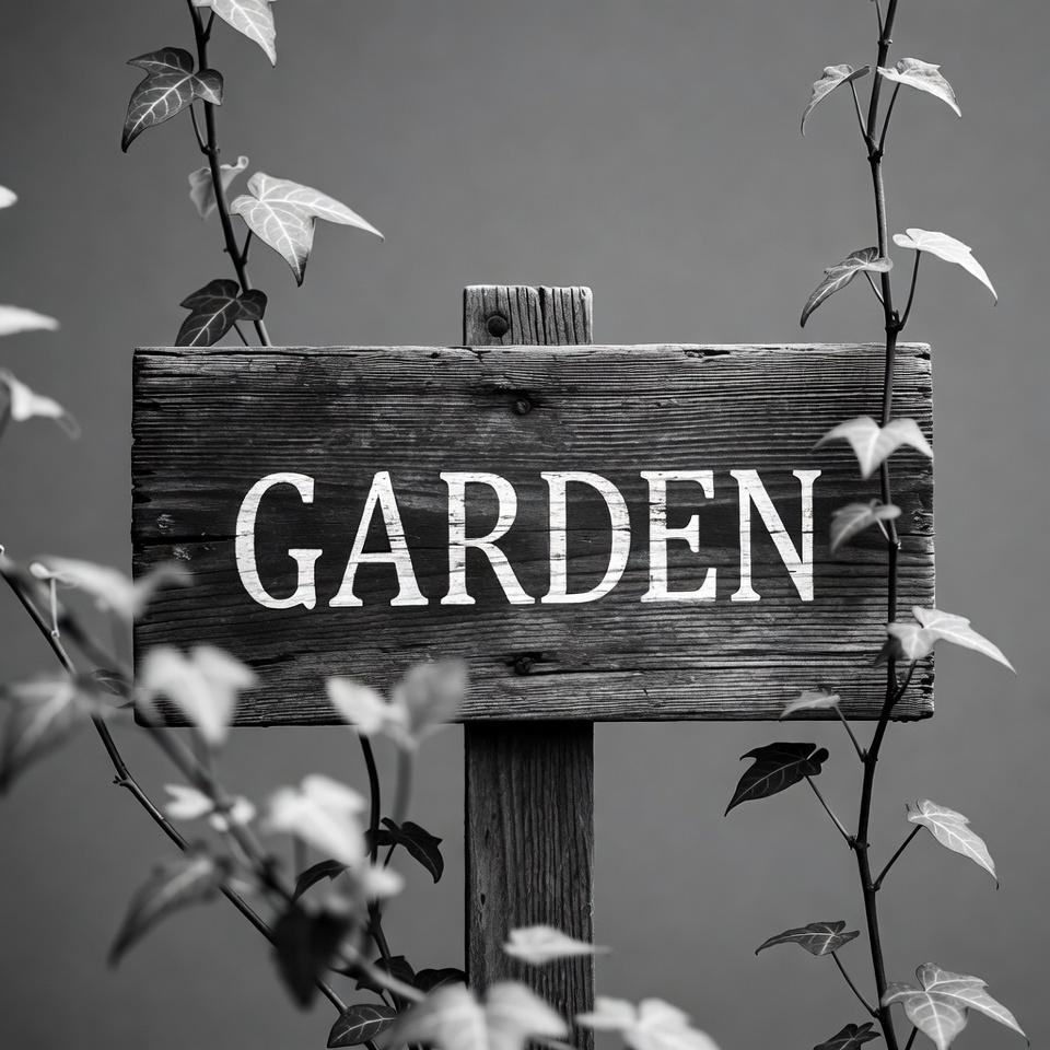 A wooden sign reading 'GARDEN' stands on a post surrounded by ivy leaves. The image is in black and white with a gray background. The sign has a rustic texture and bold white lettering.