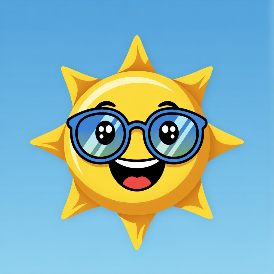 A vibrant yellow cartoon sun with a cheerful face wears blue sunglasses and smiles widely on a solid blue background. It has pointed rays extending outward and shiny reflections on the lenses. The illustration features big sparkling eyes and a red mouth.